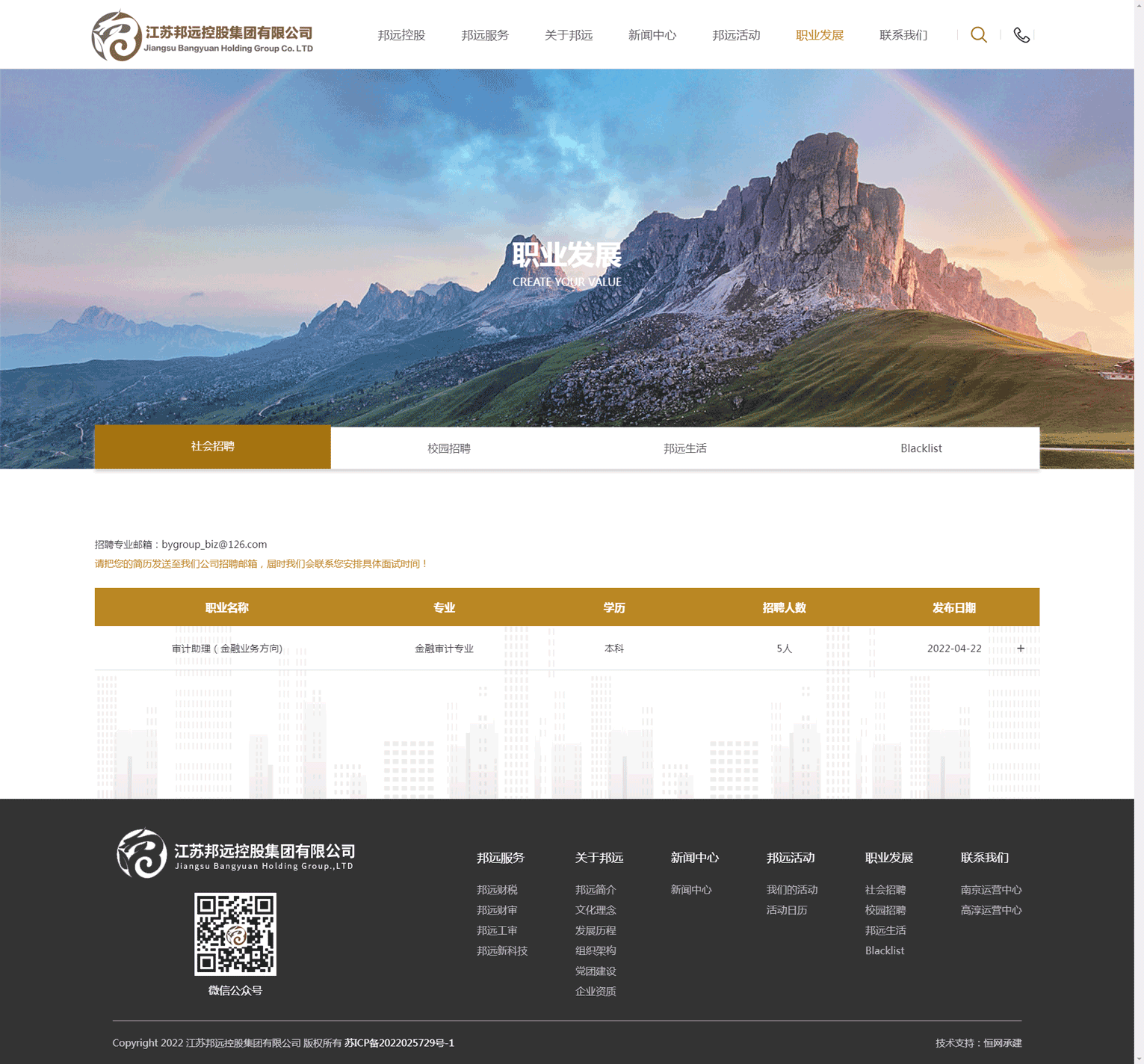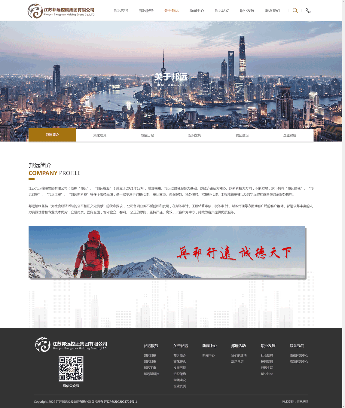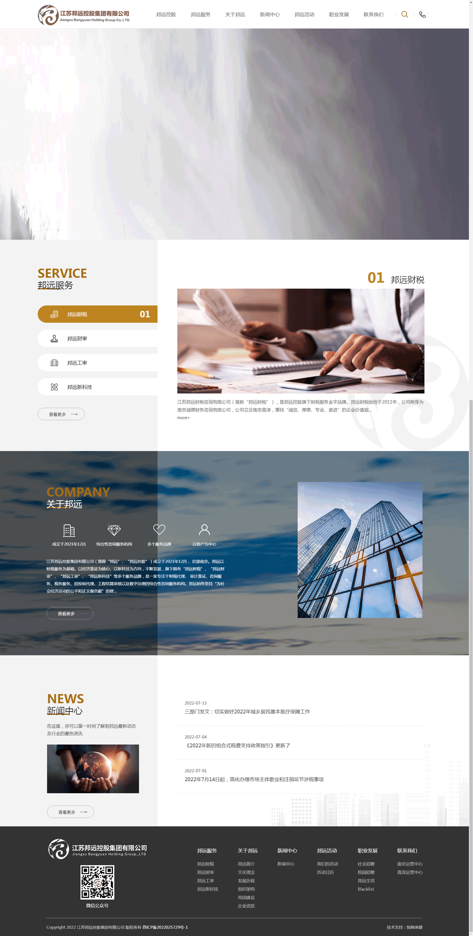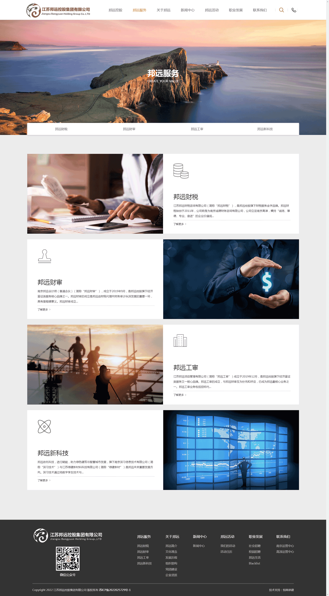 江蘇邦遠控股集團有限公司(簡稱“邦遠”、“邦遠控股”)成立于2021年12月, 總部南京。邦遠以財稅服務為基礎、以經濟鑒證為核心、以新科技為方向,不斷發(fā)展,旗下擁有“邦遠財稅”、“邦遠財審”、“邦遠工審”、“邦遠新科技”等多個服務品牌,是一家專注于財稅代理、 審計鑒證、咨詢服務、稅務服務、招投標代理、工程結算審核以及數字治理的綜合性咨詢服務機構。 邦遠始終堅持“為社會經濟活動的公平和正義做貢獻”的使命要求, 公司各項業(yè)務不斷創(chuàng)新和發(fā)展,在財務審計、工程結算審核、稅務審 計、財務代理等方面擁有廣泛的客戶群體。邦遠依靠豐富的人力資源優(yōu)勢和專業(yè)技術優(yōu)勢,立足南京、面向全國,恪守獨立、客觀、 公正的原則,堅持嚴謹、高效,以客戶為中心,持續(xù)為客戶提供優(yōu)質服務。
