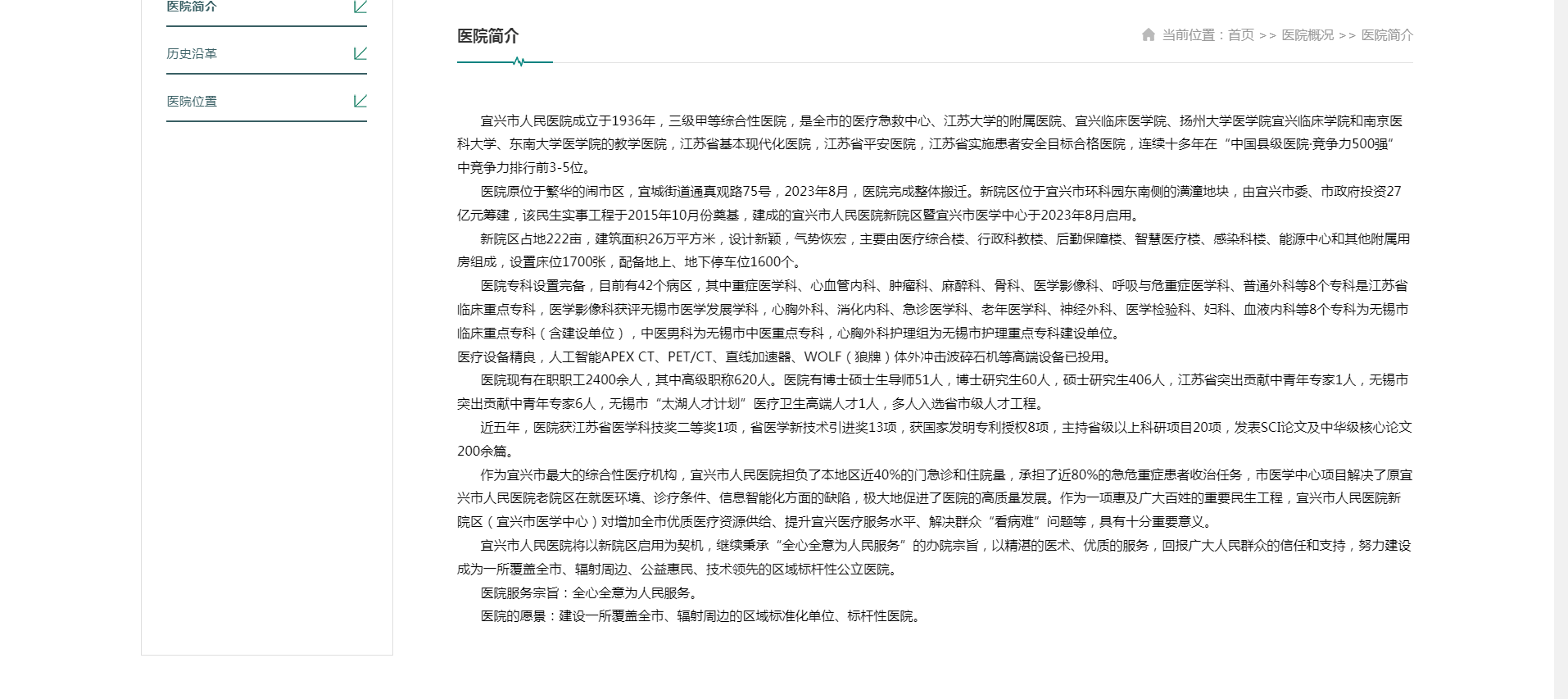 宜興市人民醫院成立于1936年,三級甲等綜合性醫院,是全市的醫療急救中心、江蘇大學的附屬醫院、宜興臨床醫學院、揚州大學醫學院宜興臨床學院和南京醫科大學、東南大學醫學院的教學醫院,江蘇省基本現代化醫院,江蘇省平安醫院,江蘇省實施患者安全目標合格醫院,連續十多年在“中國縣級醫院·競爭力500強”中競爭力排行前3-5位。 醫院原位于繁華的鬧市區,宜城街道通真觀路75號,2023年8月,醫院完成整體搬遷。新院區位于宜興市環科園東南側的潢潼地塊,由宜興市委、市政府投資27億元籌建,該民生實事工程于2015年10月份奠基,建成的宜興市人民醫院新院區暨宜興市醫學中心于2023年8月啟用。 新院區占地222畝,建筑面積26萬平方米,設計新穎,氣勢恢宏,主要由醫療綜合樓、行政科教樓、后勤保障樓、智慧醫療樓、感染科樓、能源中心和其他附屬用房組成,設置床位1700張,配備地上、地下停車位1600個。 醫院專科設置完備,目前有42個病區,其中重癥醫學科、心血管內科、腫瘤科、麻醉科、骨科、醫學影像科、呼吸與危重癥醫學科、普通外科等8個專科是江蘇省臨床重點專科,醫學影像科獲評無錫市醫學發展學科,心胸外科、消化內科、急診醫學科、老年醫學科、神經外科、醫學檢驗科、婦科、血液內科等8個專科為無錫市臨床重點專科(含建設單位),中醫男科為無錫市中醫重點專科,心胸外科護理組為無錫市護理重點專科建設單位。 醫療設備精良,人工智能APEX CT、PET/CT、直線加速器、WOLF(狼牌)體外沖擊波碎石機等高端設備已投用。 醫院現有在職職工2400余人,其中高級職稱620人。醫院有博士碩士生導師51人,博士研究生60人,碩士研究生406人,江蘇省突出貢獻中青年專家1人,無錫市突出貢獻中青年專家6人,無錫市“太湖人才計劃”醫療衛生高端人才1人,多人入選省市級人才工程。 近五年,醫院獲江蘇省醫學科技獎二等獎1項,省醫學新技術引進獎13項,獲國家發明專利授權8項,主持省級以上科研項目20項,發表SCI論文及中華級核心論文200余篇。 作為宜興市最大的綜合性醫療機構,宜興市人民醫院擔負了本地區近40%的門急診和住院量,承擔了近80%的急危重癥患者收治任務,市醫學中心項目解決了原宜興市人民醫院老院區在就醫環境、診療條件、信息智能化方面的缺陷,極大地促進了醫院的高質量發展。作為一項惠及廣大百姓的重要民生工程,宜興市人民醫院新院區(宜興市醫學中心)對增加全市優質醫療資源供給、提升宜興醫療服務水平、解決群眾“看病難”問題等,具有十分重要意義。 宜興市人民醫院將以新院區啟用為契機,繼續秉承“全心全意為人民服務”的辦院宗旨,以精湛的醫術、優質的服務,回報廣大人民群眾的信任和支持,努力建設成為一所覆蓋全市、輻射周邊、公益惠民、技術領先的區域標桿性公立醫院。