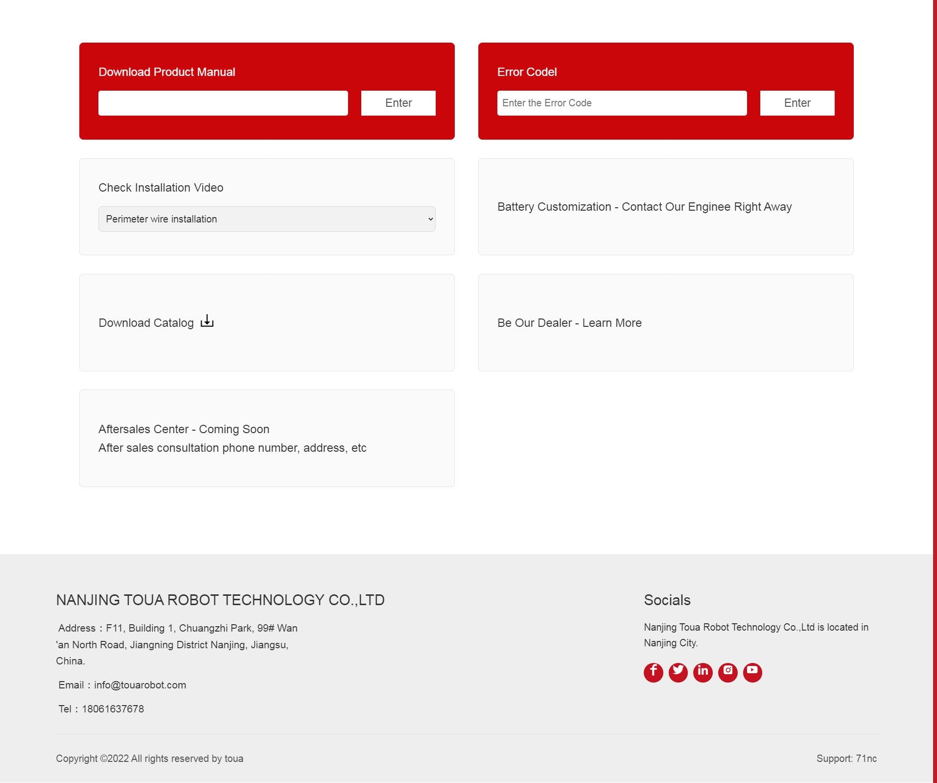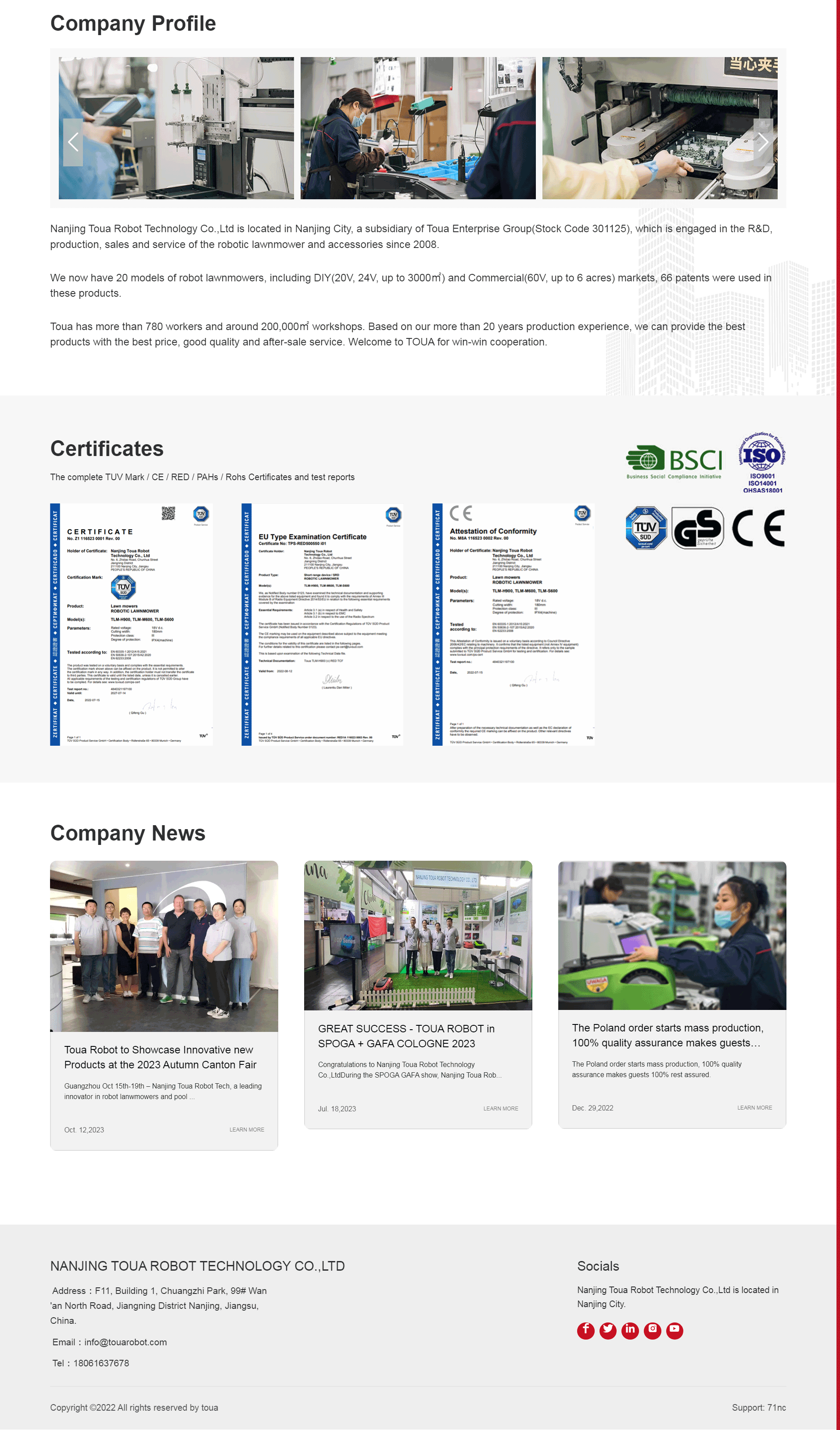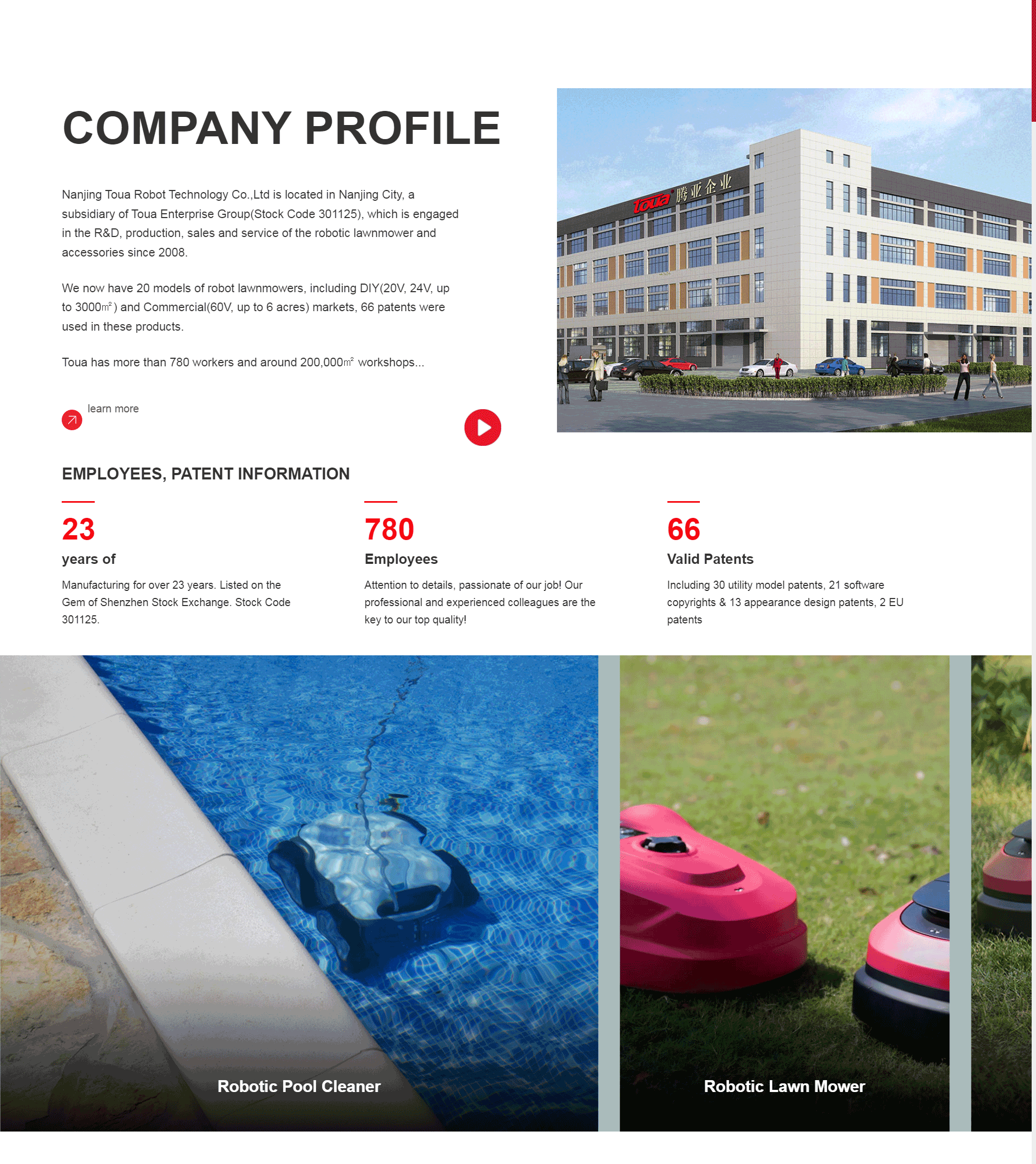 Nanjing Toua Robot Technology Co.,Ltd is located in Nanjing City, a subsidiary of Toua Enterprise Group(Stock Code 301125), which is engaged in the R&D, production, sales and service of the robotic lawnmower and accessories since 2008. We now have 20 models of robot lawnmowers, including DIY(20V, 24V, up to 3000㎡) and Commercial(60V, up to 6 acres) markets, 66 patents were used in these products.