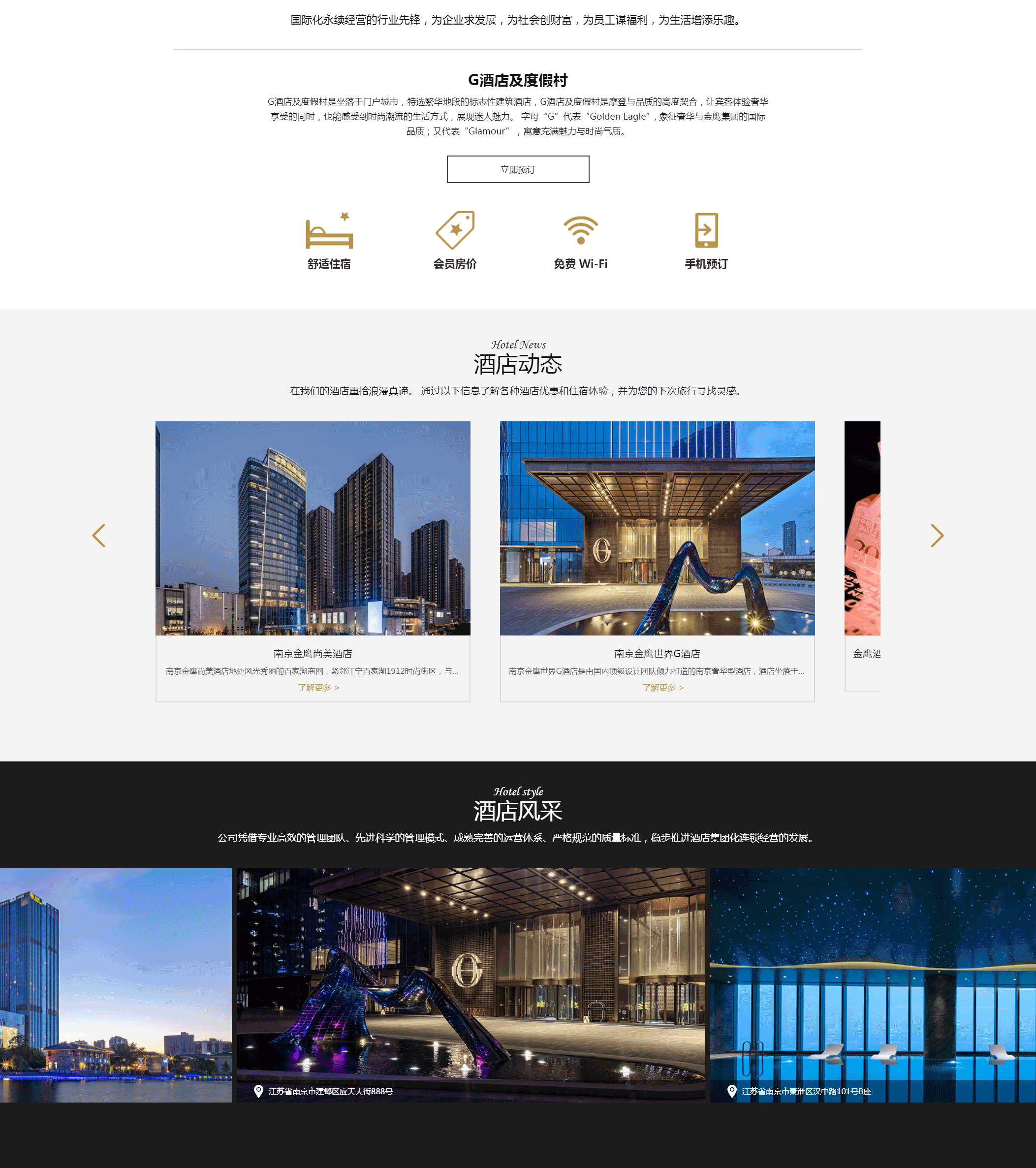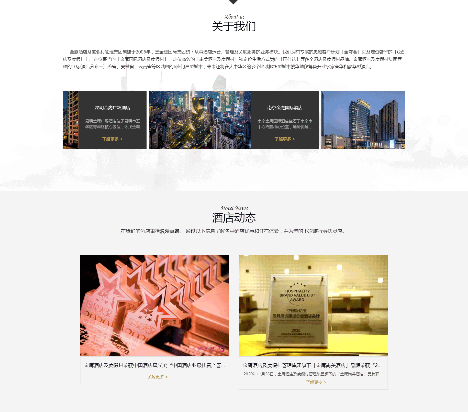 金鷹酒店及度假村管理集團創建于2006年,是金鷹國際集團旗下從事酒店運營、管理及關聯服務的業務板塊。我們擁有專屬的忠誠客戶計劃「金尊會」以及定位奢華的「G酒店及度假村」、定位豪華的「金鷹國際酒店及度假村」、定位商務的「尚美酒店及度假村」和定位生活方式類的「國仕達」等多個酒店及度假村品牌。金鷹酒店及度假村集團管理的10家酒店分布于江蘇省、安徽省、云南省等區域內的6座門戶型城市,未來還將在大中華區的多個地域樞紐型城市繁華地段籌備開業多家奢華和豪華型酒店。