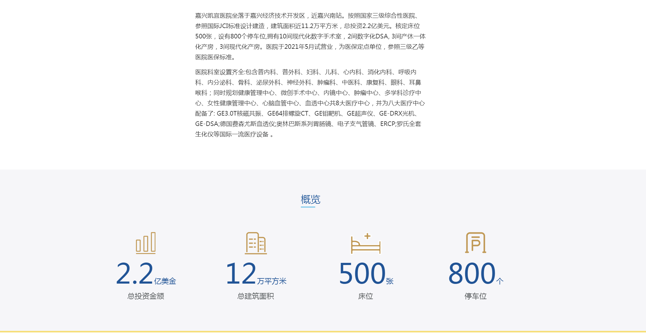 嘉興凱宜醫院坐落于嘉興經濟技術開發區,近嘉興南站。按照國家三級綜合性醫院、參照國際JCI標準設計建造,建筑面積近11.2萬平方米,總投資2.2億美元。核定床位500張,設有800個停車位,擁有10間現代化數字手術室,2間數字化DSA,3間產休一體化產房,3間現代化產房。醫院于2021年5月試營業,為醫保定點單位,參照三級乙等醫院醫保標準。