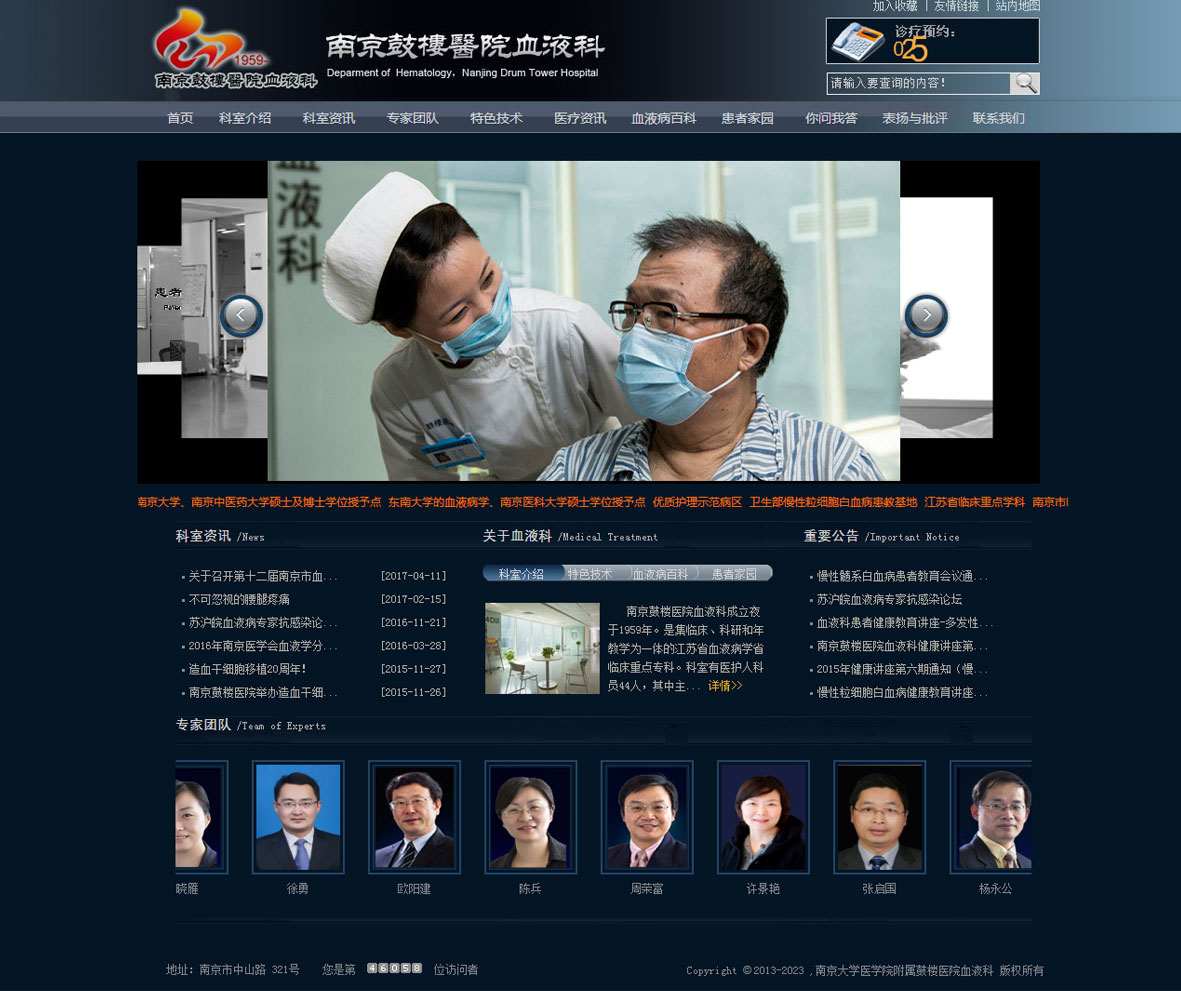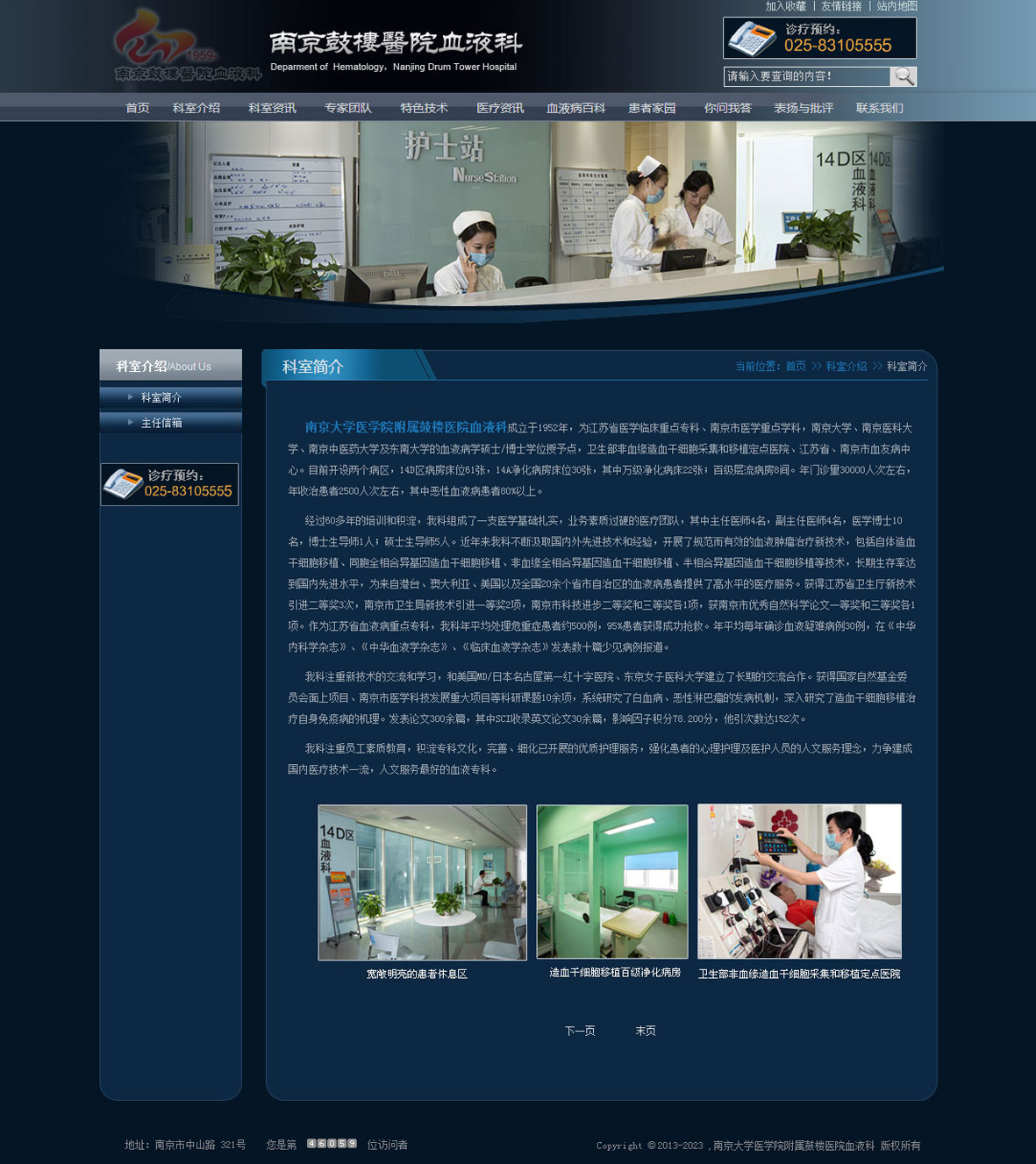 南京大學醫(yī)學院附屬鼓樓醫(yī)院血液科成立于1952年,為江蘇省醫(yī)學臨床重點專科、南京市醫(yī)學重點學科,南京大學、南京醫(yī)科大學、南京中醫(yī)藥大學及東南大學的血液病學碩士/博士學位授予點,衛(wèi)生部非血緣造血干細胞采集和移植定點醫(yī)院、江蘇省、南京市血友病中心。目前開設(shè)兩個病區(qū),14D區(qū)病房床位61張,14A凈化病房床位30張,其中萬級凈化病床22張;百級層流病房8間。年門診量30000人次左右,年收治患者2500人次左右,其中惡性血液病患者80%以上。